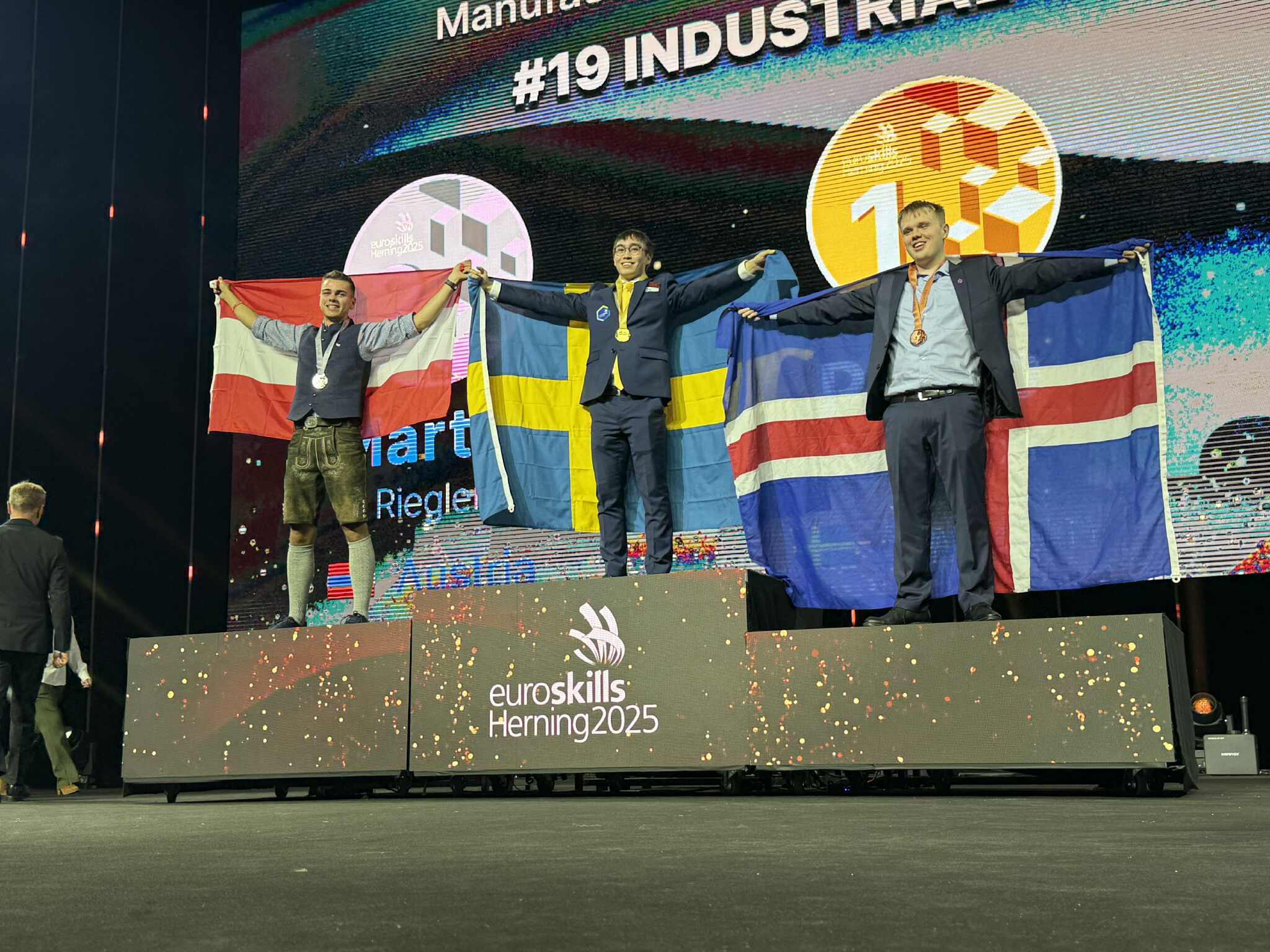 Gunnar Guðmundsson, keppandi í iðnaðarrafmagni, vann til bronsverðlauna í sinni keppnisgrein á Euroskills 2025 sem fram fór í Herning í Danmörku í vikunni. Verðlaunaafhending og lokahátíð keppninnar fór fram nú í kvöld. Gunnar hlaut 719 stig í keppninni. Annar varð Martin Riegler frá Austurríki með 721 stig en Philip Svensson frá Svíþjóð hlaut gullverðlaun með 737 stig.